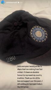 रोहित शर्मा ने आगे लिखा कि ‘इतने साल आप सभी के प्यार और सपोर्ट के लिए शुक्रिया’. रोहित शर्मा ने अपनी इंस्टाग्राम स्टोरी में ये भी बताया कि वो भारत के लिए ODI फॉर्मेट में खेलते रहेंगे. बता दें कि रोहित शर्मा ने टी20 वर्ल्ड कप 2024 के बाद T20 क्रिकेट से भी संन्यास का ऐलान किया था।